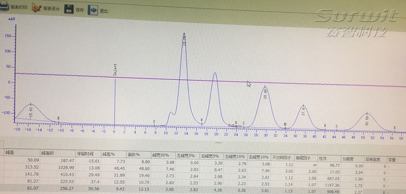 按着说明书对凝胶色谱柱进行校准,凝胶渗透色谱校准溶液得到的色谱峰应满足以下条件,所有峰型均匀对称,玉米油和邻苯二甲酸二酯的色谱峰之间分辨率应大于85%,邻苯二甲酸二酯和甲氧滴滴涕的色谱峰之间分辨率大于85%,甲氧滴滴涕和苝的色谱峰之间的分辨率大于85%,苝和硫的色谱峰不能重叠,基线分离大于90%。