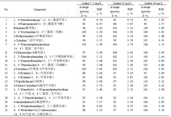 芳香胺混合标准储备液:分别称取21种芳香胺标准品,用二氯甲烷配成1000mg/L的混合标准储备液,低温保存,备用;