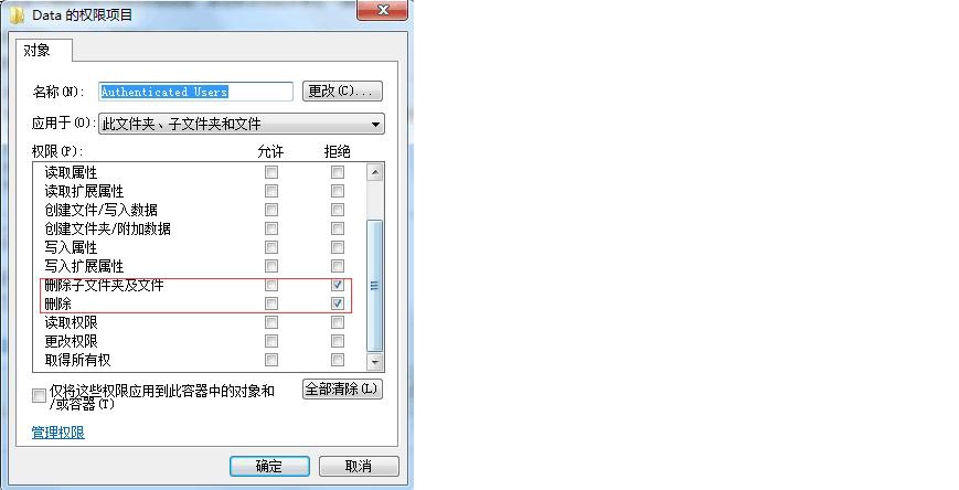 爱彩82、确定电脑为NTFS后,在Survey软件安装目录下找到DAT文件夹,以WIN7为例说明设置方法:右键属性→安全→高级→更改权限→选择Authenticated Users→编辑→对删除子文件夹及文件、删除两项的拒绝进行打钩如下图: